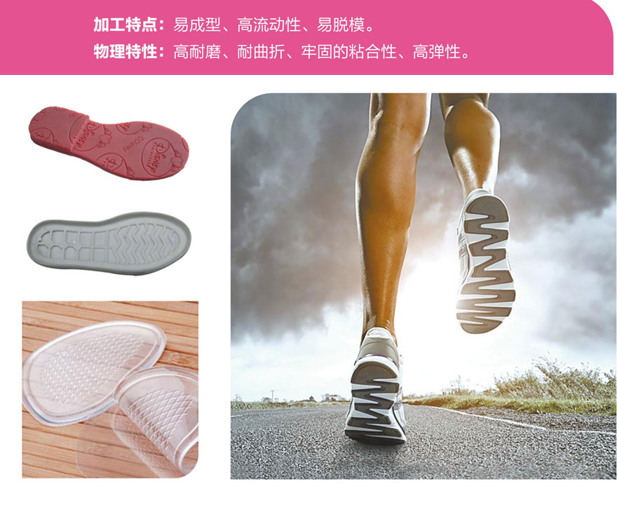TPE/TPR鞋底材料一般是SEBS與SBS基礎(chǔ)分別與其它混合物共混改性的一種熱塑性彈性體材料,經(jīng)過擠出,注射,模壓等工藝加工后成型制成的鞋底具有防滑、耐低溫、彎曲性強、透氣性好,密度小、粘接強度牢等優(yōu)點,而且廢料,邊料可以回收再生。因此,TPE/TPR鞋底材料很快在制鞋工業(yè)中得到重視并迅速發(fā)展。