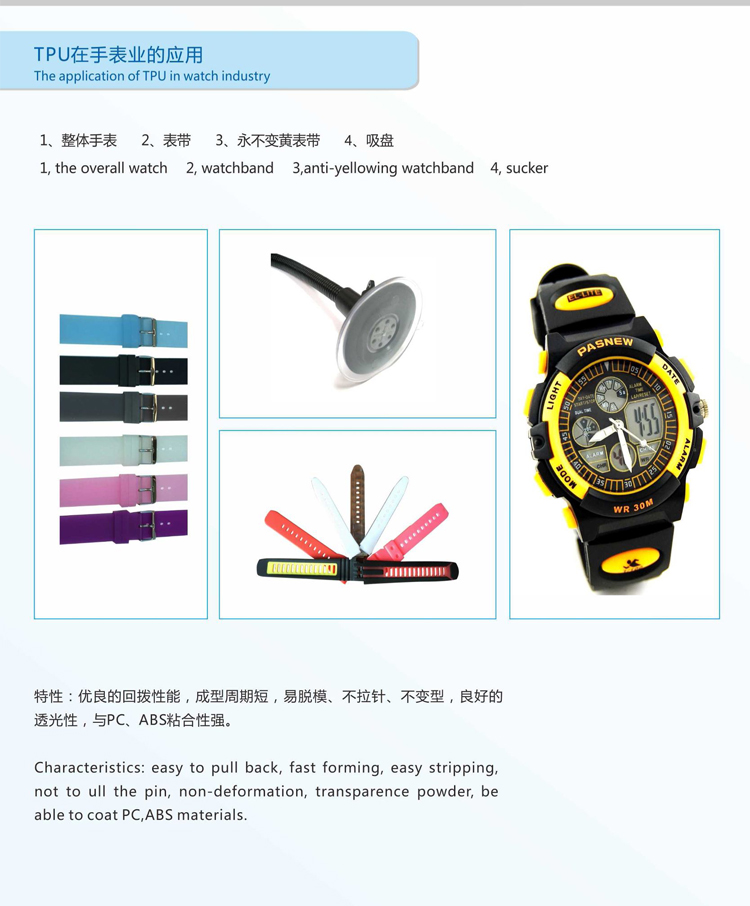 產(chǎn)品描述:TPU在手表行業(yè)的應(yīng)用:1.整體手表2.表帶3.永不變黃表帶4.吸盤TPU手表產(chǎn)品的特性:優(yōu)良的回?fù)苄阅埽尚椭芷诙?,易脫模,不拉針,不變型,良好的透光性,與PC、ABS粘合性強(qiáng)。