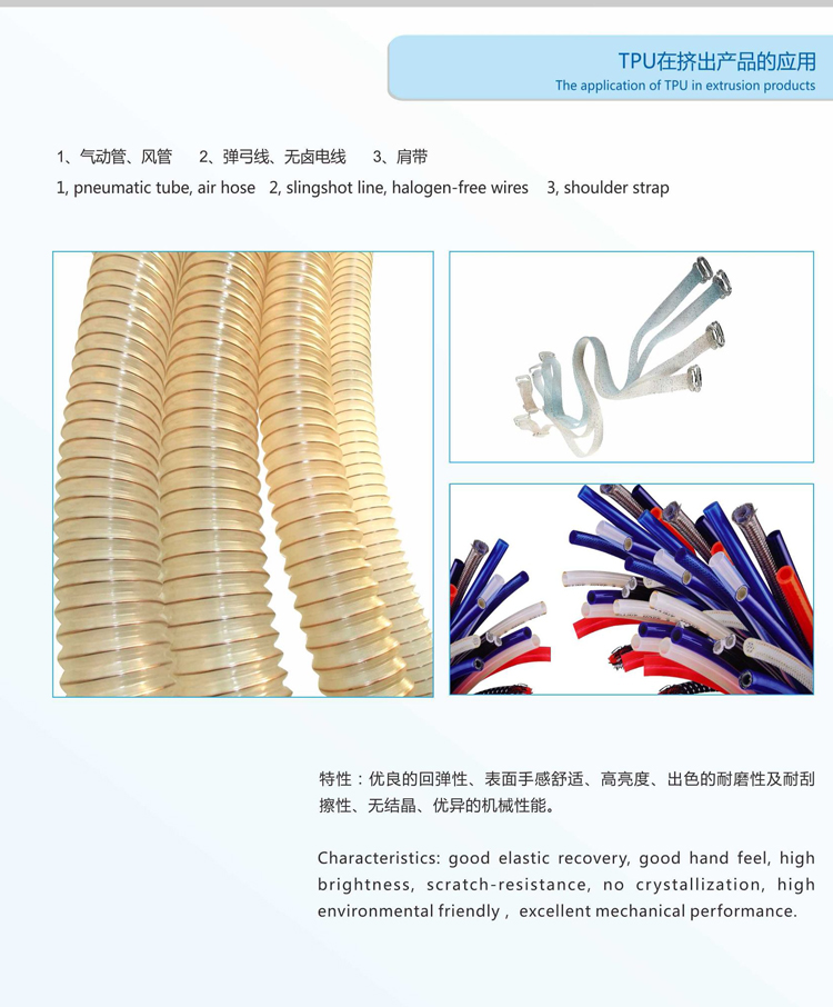 產(chǎn)品描述:TPU在擠出產(chǎn)品的應(yīng)用:1.氣動管、風管2.彈弓線,無鹵電線3.肩帶擠出TPU產(chǎn)品的特性:優(yōu)良的回彈性、表面手感舒適、高亮度、出色的耐磨性及耐刮擦性、無結(jié)晶、優(yōu)異的機械性能。