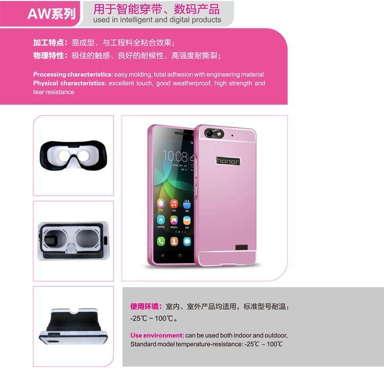 本公司開(kāi)發(fā)的智能穿戴TPE原料系列材料,可用于生產(chǎn)智能手環(huán),電子產(chǎn)品,數(shù)碼產(chǎn)品。該系列TPE材料具有類似硅膠的爽滑手感,與皮膚接觸無(wú)刺激性,耐臟耐汗液,耐油污,表面耐刮花性好,彈性優(yōu)良。